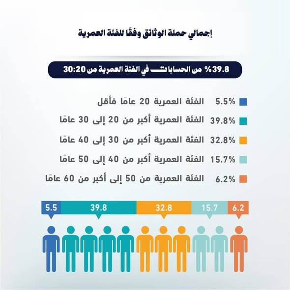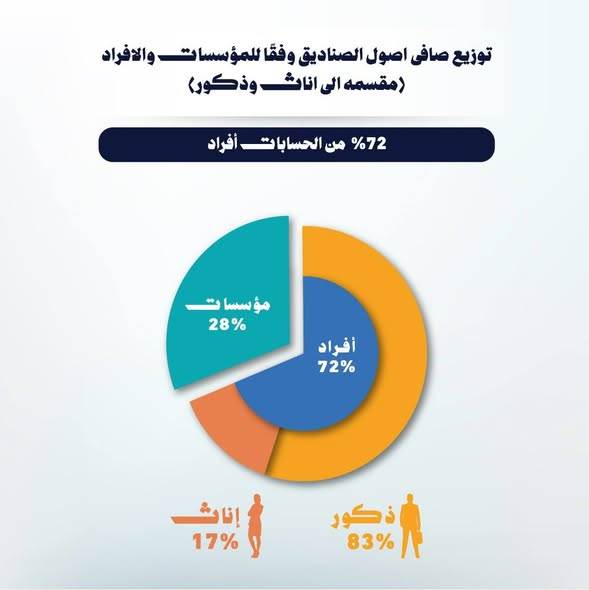 واوضح التقرير أن حسابات الأفراد تستحوذ على نحو 72% من إجمالي الحسابات، يتوزعون بواقع 83% للذكور و17% للإناث، فيما تمثل حسابات المؤسسات نحو 28% من الإجمالي. كما أشار إلى أن الفئة العمرية " أكبر من 20 إلى 30 عامًا "استحوذت على النسبة الأكبر من حسابات هذا النوع من الاستثمار، بنحو 39.8%.