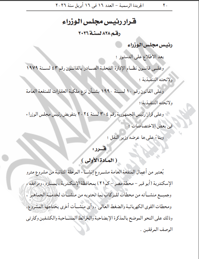 نشرت الجريدة الرسمية في عددها الصادر اليوم الخميس قرار رئيس مجلس الوزراء باعتبار مشروع إنشاء المرحلة الثانية من مترو الإسكندرية «أبو قير – محطة مصر – كم 21» بمحافظة الإسكندرية من أعمال المنفعة العامة.