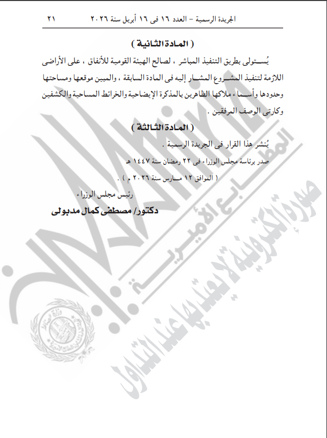 كما نصت المادة الثانية من القرار على الاستيلاء بطريق التنفيذ المباشر لصالح الهيئة القومية للأنفاق على الأراضي اللازمة لتنفيذ المشروع، وفقًا للمواقع والمساحات والحدود وأسماء الملاك الواردة بالمستندات الرسمية.