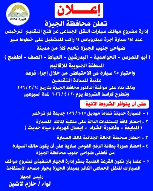 تُعلن محافظة الجيزة عن فتح باب التقديم لترخيص عدد (115) سيارة أجرة ميكروباص سعة 14 راكبًا، للعمل على خطوط سير ضواحي جنوب الجيزة، والتي تشمل مدن: (أبو النمرس – الحوامدية – البدرشين – العياط – الصف – أطفيح)، بالإضافة إلى خطوط المنطقة الجنوبية للأقاليم.