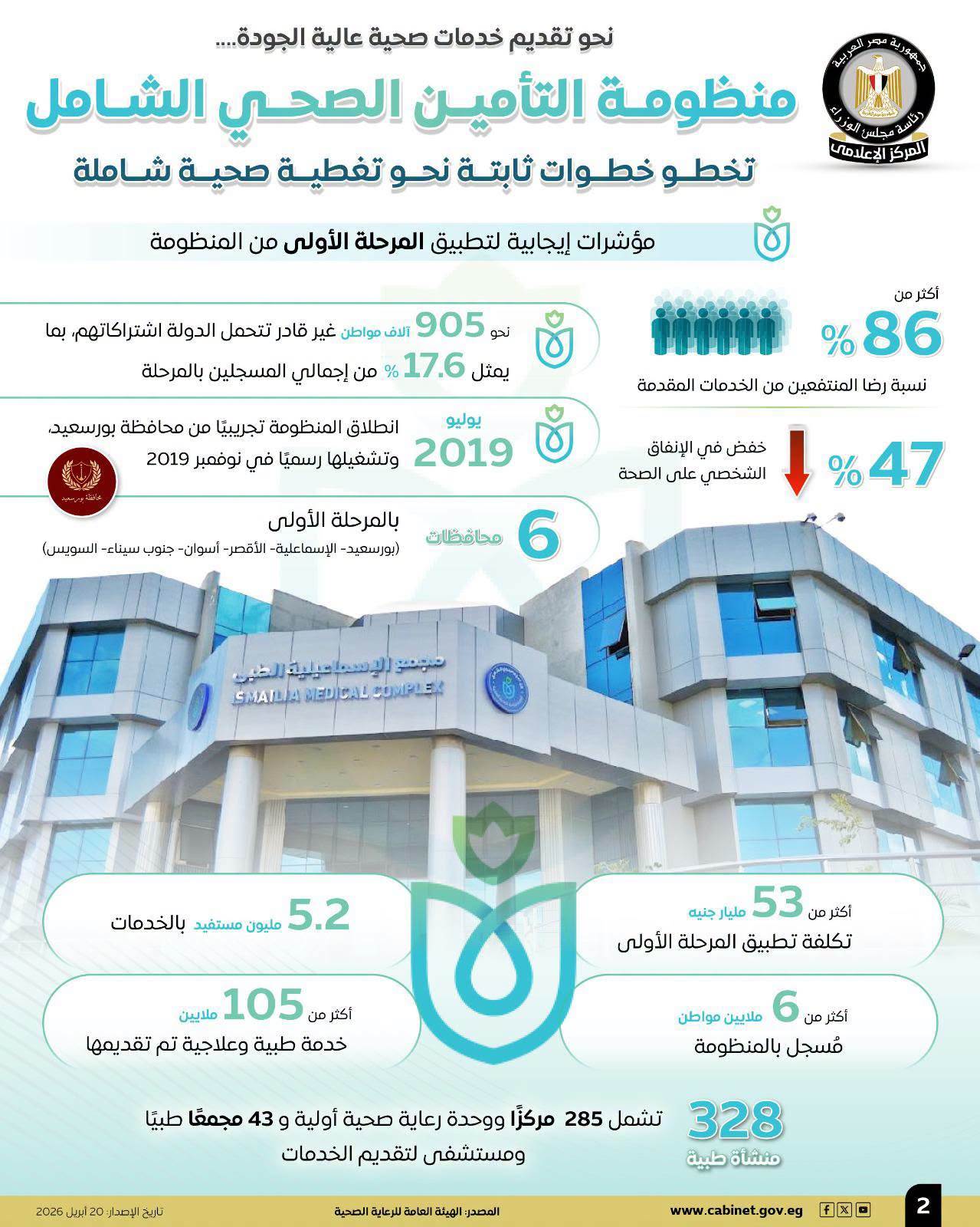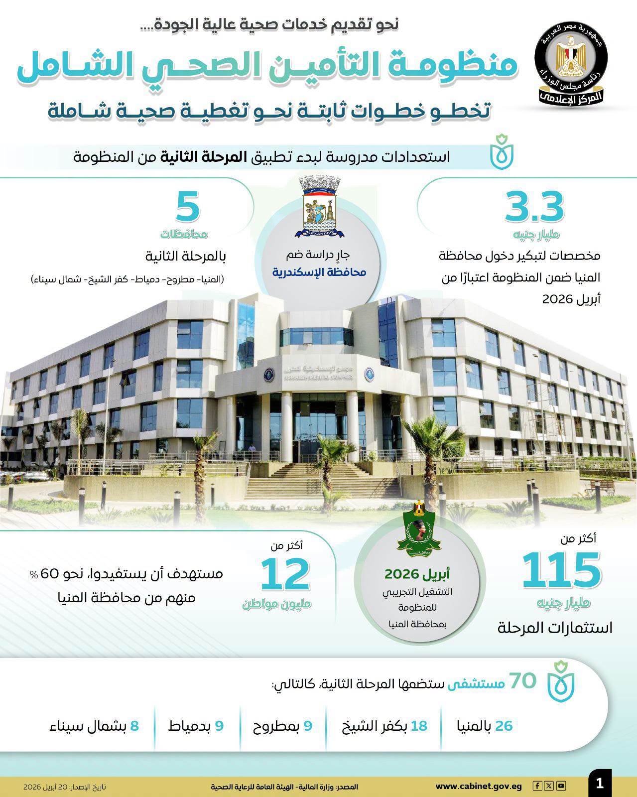 وتناولت الإنفوجرافات أن هناك استعدادات مدروسة لبدء تطبيق المرحلة الثانية من المنظومة، شملت تخصيص 3.3 مليار جنيه لتبكير دخول محافظة المنيا ضمن المنظومة، على أن يتم بدء التشغيل التجريبي للمنظومة بالمحافظة اعتبارًا من أبريل 2026، لتصل عدد محافظات المرحلة الثانية إلى 5 محافظات هم "المنيا – مطروح – دمياط – كفر الشيخ – شمال سناء"، وجارٍ دراسة ضم محافظة الإسكندرية.
