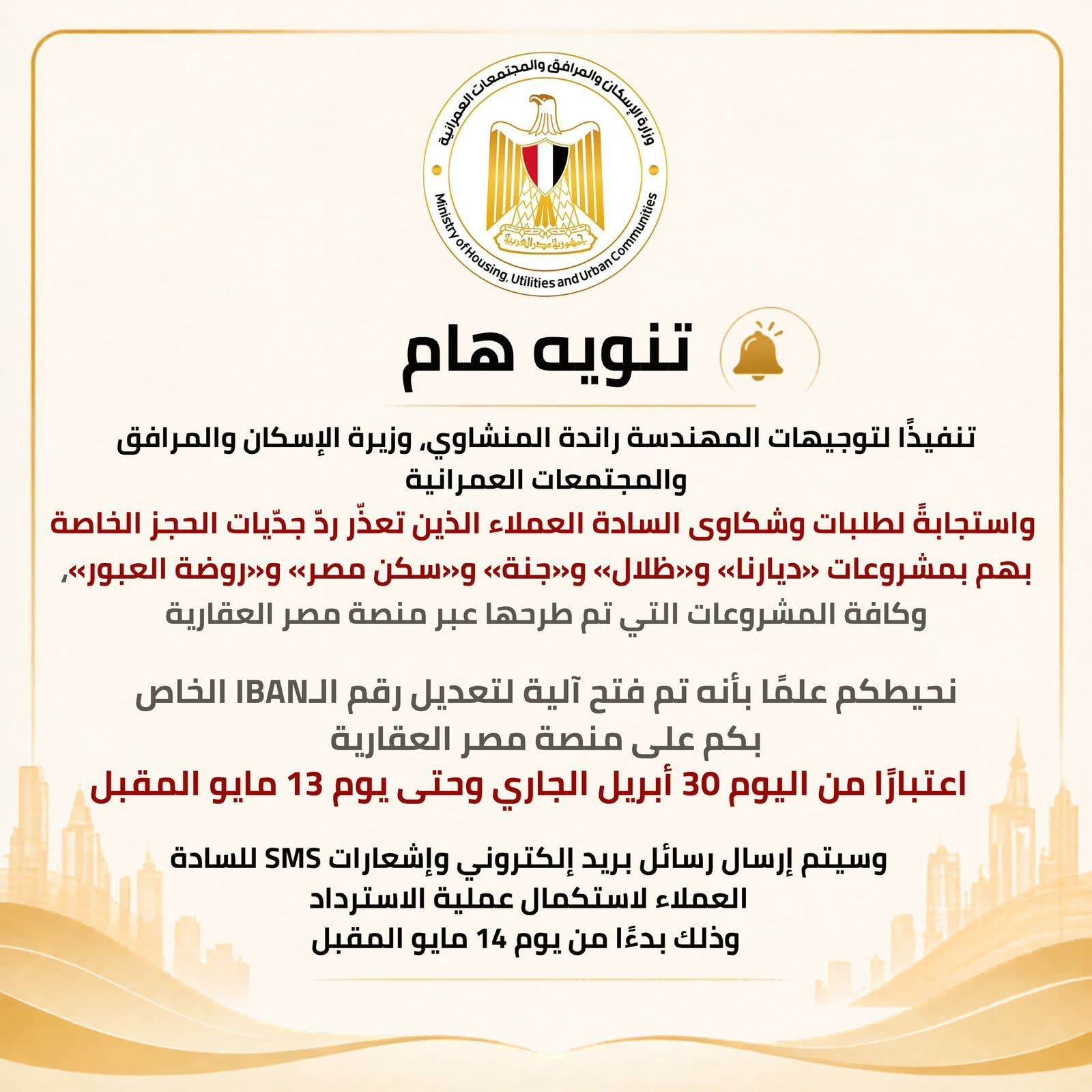 تنفيذًا لتوجيهات المهندسة راندة المنشاوي، وزيرة الإسكان والمرافق والمجتمعات العمرانية، واستجابةً لطلبات وشكاوى العملاء الذين تعذّر ردّ جدّيات الحجز الخاصة بهم بمشروعات «ديارنا» و«ظلال» و«جنة» و«سكن مصر» و«روضة العبور»، وكافة المشروعات التي تم طرحها عبر منصة مصر العقارية،